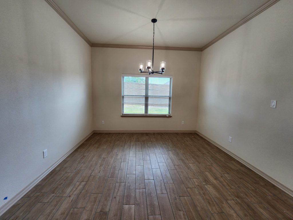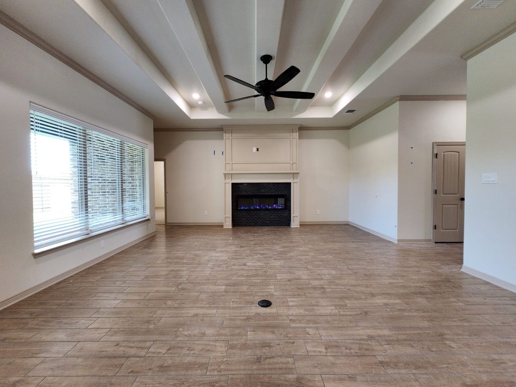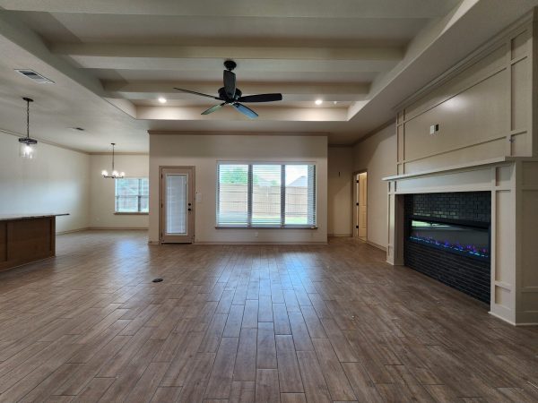 Step into a warm and inviting living area featuring wood-beamed ceilings and a sleek electric fireplace, perfect for year-round ambiance. The open-concept kitchen flows seamlessly into a spacious dining area and showcases soft-close cabinetry, GE Profile built-in appliances, and luxurious granite countertops—ideal for both everyday living and entertaining.