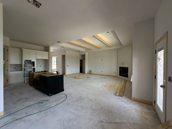 Step into an open-concept layout enhanced by vaulted ceilings, a wood-beamed living room, and a sleek electric fireplace that adds warmth and sophistication. The gourmet kitchen features soft-close cabinetry, quartz countertops, GE stainless steel appliances, and a large island perfect for meal prep and gathering.