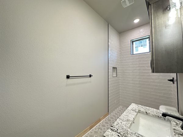 Each bedroom includes its own private en-suite bath, while a separate powder room ensures convenience for guests. The open-concept living area showcases wood-beamed ceilings and a sleek electric fireplace, creating a warm and inviting atmosphere.